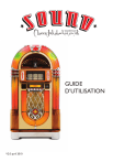 GUIDE D’UTILISATION V2.0 april 2010 Table des Matières Section1 - Introduction Section2 – Réception de la livraison Section3 – Insertion des porte-titres et les compacts disques Section 4 - Faire fonctionner le juke-box Section 5 – Fonctionnement de l'option “Diamond” Section 6 – Modèles “Xi” et “Melody iVideo” Section 7 – Fonctionnement avec l'iPod Section 8 – Brancher des enceintes externes à votre juke-box Section 9 – Réglage de la tonalité de votre juke-box, Grave/ Aigu Pg 2 Pg 3 Pg 4 Pg 6 Pg 8 Pg 9 Pg 10 Pg11 Pg 14 Section 1- Introduction Merci d’avoir acheté un juke-box rétro produit par Sound Leisure, le premier fabricant au monde de juke-box.Ce produit est réalisé pour vous offrir des années de divertissement et une utilisation facile. Ce guide d’utilisation fournit toutes les informations qui vous seront nécessaires pour installer et utiliser le juke-box. Fig 1a Prises d’entrée audio Prises de sortie vidéo Commutateur de réinitialisation Mécanisme de verrouillage, Verrou Prise secteur. Interrupteur On/Off (allumé/éteint) 22 Jukebox montré en mode “transport” tel qu’il est livré Barre verticale de transport Barre de retenue de l’unité rotative Plaque de protection du mécanisme frontal pour le transport Interrupteur de transport Ecrous à oreilles de montage pour suspension du mécanisme (voir aussi Ill. 3a) Fig 1b Section 2 - Réception de la livraison Modèles 1015, Broadway Melody, Manhattan et Gazelle See Fig 1b for details Fig 2a Ouvrir la porte avec la clé (réf. CPS1) Retirez la barre verticale de transport. Retirez la barre de retenue de l’unité rotative. Retirez la plaque de protection du mécanisme frontal pour le transport Allumez sur “ON” (Ill. 2a) Le texte “TRANSIT” (transport) s'affichera. Fig 2b 3 Fig 2c Mettez l’interrupteur de « transport » (voir Ill. 2c) sur « Operate » (Fonctionnement) en bas. Le mécanisme de soulèvement des disques devrait effectuer un mouvement latéral vers la gauche puis retourner dans une position centrale. Localisez les 4 écrous à oreilles situés sous l'étagère qui soutient le mécanisme pour CD. Voir Ill.3a. Desserrez les écrous à oreilles sur toute la longueur. Fermez la porte du jukebox. La machine est maintenant opérationnelle. Fig 3a Si le jukebox doit être déplacé, suivez la procédure suivante : Allumez le jukebox. Voir Ill. 2a. Mettez l’interrupteur de « transport » sur « TRANSIT » (haut). Voir Ill. 2c Mettez en place et vissez la barre de transport verticale. Voir Ill. 2b. Remettez la barre de retenue de l’unité rotative et fixez-la avec des vis. Voir Ill. 2a Serrez les 4 écrous à oreilles situés sous l'étagère qui soutient le mécanisme de CD. Voir Ill. 3a. Fermez la porte et éteignez le jukebox. Le jukebox est maintenant prêt pour le transport. Ecrous à oreilles de montage pour suspension du mécanisme (voir aussi Ill. 1b) Section 3- Insertion des porte-titres et des compact discs Porte-Titres Le jukebox présente 70 porte-titres de CD, le mécanisme contient 80 CD. Avec la porte ouverte, localisez l’arrière du boîtier du mécanisme noir des porte-titres, voir Ill. 4a. Sous ce boîtier, un câble de liaison est attaché au moyen de serre-câbles en plastique. Décrochez le câble en déformant ces serre-câbles pour le libérer. Voir Ill. 4a. Faites coulissez vers l'arrière les deux boulons en laiton. Voir Ill.4d. L'ensemble du boîtier du mécanisme se soulèvera pour pouvoir être sorti. Il sera ainsi plus facile pour vous de travailler en le posant sur un tabouret ou sur une chaise 4 Bouton Blanc boîtier de mécanisme des Porte-Titres boulons en laiton de retenue du mécanisme des porte-titres serre-câbles blancs Fig 4a Pour continuer l’installation des porte-titres, localisez la position No 100. Chaque porte-titre avec étiquette imprimée est perforé au milieu. Déchirez le long de cette Fig 4b performation et insérez les deux moitiés dans la fente en les insérant dans les languettes en plastique. (Voir Ill. 4b) Insérez un porte-titre dans la fente n° 101, puis faites tourner le mécanisme pour avoir la fente disponible suivante, en pressant le bouton blanc à l'arrière du boîtier du mécanisme. Voir Ill. 4c. Continuez jusqu'à ce que toutes les étiquettes imprimées soient insérées. Remettez le boîtier à sa place, et revissez les vis en laiton pour le fixer. Le câble trainant devra maintenant être replié à sa place, et maintenu avec les serre-câbles en plastique. Fig 4c Fig 4d 5 Compact discs. Le range-CD est numéroté de façon à pouvoir correspondre aux porte-titres, (fente 00 =100, fente 01 = 101, fente 02 =102 etc.). Voir ill. 5a. Les CD doivent être insérés avec la surface de lecture tournée vers la gauche, et l’étiquette des CD tournée vers la droite. Fig 5a Merci de vous assurer que les disques sont insérés bien droits Section 4 - Faire fonctionner le Jukebox Effectuer les sélections. Quand les disques et les étiquettes sont installés, il est possible de sélectionner les titres des chansons à l’aide du clavier situé à l’avant du jukebox ou à l’aide de la télécommande. Pour éviter une surcharge des haut-parleurs au moment de l'allumage du jukebox, le volume est réinitialisé sur un niveau de volume faible. Pour augmenter le volume, sélectionnez un titre, attendez que la lecture du CD commence, puis réglez le volume à l’aide du bouton “Vol +” sur la télécommande. Pour les instructions de la télécommande, voir Ill. 6a. Quand vous utilisez la télécommande, visez le capteur carré sur la gauche, à mi-chemin vers le bas du jukebox. Pour jouer un morceau, composez les 3 chiffres correspondant au disque, puis les deux chiffres correspondant au morceau désiré. Pour jouer tout un album sans devoir sélectionner les morceaux un à un, composez les 3 chiffres du disque sur la télécommande, puis composez “00”. Pour annuler cette commande, 