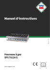 2025-07-25 Manuel d‘instructions Fourneau à gaz SPS 7012A G www.rmgastro.com FOURNEAU À GAZ · SPS 7012A G · 00014781 OBSAH 1. DÉCLARATION DE CONFORMITÉ 3 2. DONNÉES TECHNIQUES 3 3. TABLEAU DES GAZ AUXQUELS LE PRODUIT EST DESTINÉ 3 4. EMPLACEMENT DE L'ÉLECTRICITÉ 5 5. EMPLACEMENT GAZ 5 6. MESURES DE SÉCURITÉ DU POINT DE VUE DE LA PROTECTION INCENDIE 5 7. INSTALLATION 6 8. CONTRÔLE DES PERFORMANCES THERMIQUES 6 9. RACCORDEMENT DU TUYAU DE RACCORDEMENT AU GAZ 7 10. RACCORDEMENT GAZ LIQUIDE 7 11. RACCORDEMENT D'EAU 7 12. CONNEXION DU CÂBLE ÉLECTRIQUE AU RÉSEAU 7 13. VÉRIFIER LES PARAMÈTRES DE L'APPAREIL POUR LE TYPE DE GAZ 8 14. VÉRIFICATION DES RÉGLAGES DE L‘APPAREIL EN FONCTION DU TYPE DE GAZ 9 15. MODE D‘EMPLOI 11 16. NETTOYAGE ET ENTRETIEN 11 2025-07-25 2 www.rmgastro.com FOURNEAU À GAZ · SPS 7012A G · 00014781 1. DÉCLARATION DE CONFORMITÉ Décret du Ministère de santé. 38/21 Sb. Règlement 197/26/CE - Règlement REACH, 1935/24/CE - Règlement relatif au contact alimentaire. Les produits répondent aux exigences du §26 de la loi n° 258/2 telle qu’en vigeur. Les produits répondent aux exigences de la directive RoHS 215/863/UE, 1/211, 517/214, 215/194, 215/195. Attention, le fabricant décline toute responsabilité en cas de dommages directs ou indirects résultant d’une mauvaise installation, d’interventions ou de modifications inappropriées, d’un entretien insuffisant, d’une utilisation incorrecte, ou encore d’autres causes mentionnées dans les conditions générales de vente. Cet appareil est exclusivement destiné à un usage professionnel et doit être manipulé par des personnes qualifiées. Les parties qui ont été réglées et sécurisées par le fabricant ou un technicien agréé ne doivent pas être modifiées par l’utilisateur. 2. DONNÉES TECHNIQUES L’étiquette de données techniques est située sur le panneau latéral ou arrière de l’appareil. Avant l’installation, étudiez le schéma de câblage et toutes les informations suivantes dans les instructions ci-jointes. Largeur nette [mm] Profondeur nette [mm] Hauteur nette [mm] Poids net [kg] Puissance gaz [kW] 1200 300 300 74.90 42.000 La puissance thermique nominale maximale et réduite, exprimée en kW, est basée sur la valeur Hi du gaz utilisé. Si le produit est connecté au GPL, la bouteille de gaz doit se trouver dans des pièces suffisamment ventilées. 3. TABLEAU DES GAZ AUXQUELS LE PRODUIT EST DESTINÉ Version Catégorie de produits Pressions de raccordement (mbar) Gaz utilisé Pays de destination A1 I2E 20 G20 DE, NL, PL, RO A1 I2ELL 20, 20 G20,G25 DE A1 I2E+ 20/25 G20/G25 BE, FR A1 I2H 20 2025-07-25 3 www.rmgastro.com FOURNEAU À GAZ · SPS 7012A G · 00014781 G20 AT, BG, CH, CZ, DK, HR, EE, ES, FI, GB, GR, IE, IT, LT, LV, NO, PT, RO, SE, SI, SK, TR, LU, CY , FR A1 I3B/P 30 G30 BG, CY, CZ, DK, GB, HR, EE, FI, FR, GR, HU, IT, LT, LV, MT, NL, NO, RO, SE, SI, SK, TR A1 I3B/P 50 G30 AT, DE, CZ, CH, FR, SK A1 I3P 37 G31 BE, CH, CZ, ES, GB, GR, IE, RO, SI, SK, FR, NL, PT, HR, IT, LT, PL, TR A1 I3+ 28-30/37 G30/G31 BE, CH, CY, CZ, EE, ES, FR, GB, GR, IE, IT, LT, PT, SI, SK, TR A1 II2E3B/P 20, 50 G20, G30 DE, PL, RO A1 II2ELL3B/P 20, 20, 50 G20, G25, G30 DE A1 II2E+3+ 20/25, 28-30/37 G20/G25, G30/G31 BE, FR A1 II2H3B/P 20, 30 G20, G30 BG, CZ, GB, DK, HR, EE, FI, GR, IT, LT, LV, NO, RO, SE, SI, SK, TR, CY, FR A1 II2H3B/P 2025-07-25 4 www.rmgastro.com FOURNEAU À GAZ · SPS 7012A G · 00014781 20, 50 G20, G30 AT, CH, CZ, FR, SK A1 II2H3P 20, 37 G20, G31 CH, CZ, ES, GB, GR, IE, RO, SI, SK A1 II2H3+ 20, 28-30/37 G20, G30/G31 CH, CY, CZ, EE, ES, GB, GR, IE, IT, LT, PT, SK, SI, TR 4. EMPLACEMENT DE L'ÉLECTRICITÉ Pour le bon fonctionnement et le placement de l'appareil, il est nécessaire de respecter toutes les normes prescrites suivantes pour le marché concerné. Déballez l'appareil et vérifiez qu'il n'a pas été endommagé pendant le transport. Placez l'appareil sur une surface horizontale (dénivelé maximum jusqu'à 2°). Les petites irrégularités peuvent être nivelées avec des pieds réglables. Si l'appareil est placé de manière à être en contact avec les parois des meubles, ceux-ci doivent résister à une température allant jusqu'à 60°C. L'installation, le réglage, la mise en service doivent être effectués par une personne qualifiée et autorisée à effectuer de telles opérations, selon les normes en vigueur. L’appareil peut être installé individuellement ou en série avec d’autres appareils de notre fabrication. Une distance minimale de 10 cm doit être respectée par rapport aux matériaux inflammables. Dans ce cas, des aménagements appropriés doivent être prévus pour garantir une isolation thermique adéquate des parties inflammables. L'appareil doit être installé uniquement sur une surface ininflammable ou contre un mur ininflammable. Les composants de l’appareil sécurisés par le fabricant ou son représentant ne doivent pas être modifiés par le personnel effectuant l’installation de l’appareil. 5. EMPLACEMENT GAZ Pour un fonctionnement et un emplacement corrects de l'appareil, il est nécessaire de respecter toutes les directives et normes du pays en question. Déballez l'appareil et vérifiez qu'il n'a pas été endommagé pendant le transport. Placez l'appareil sur une surface horizontale (dénivelé maximum jusqu'à 2°). Les petites irrégularités peuvent être nivelées avec des pieds réglables. Si l'appareil est placé de manière à être en contact avec les parois des meubles, ceux-ci doivent résister à une température allant jusqu'à 60°C. L'installation, le réglage, la mise en service doivent être effectués par une personne qualifiée et autorisée à effectuer de telles opérations, selon les normes en vigueur. L'appareil peut être installé séparément ou en série avec des appareils de notre production. Une distance minimale de 10 cm doit être respectée par rapport aux matériaux inflammabl